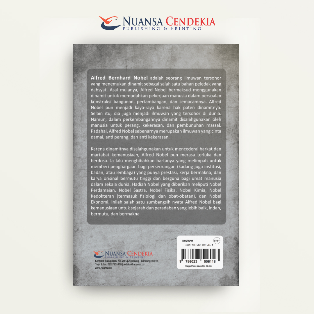 Buku Alfred Nobel: Dari Dinamit menuju Nobel Kemanusiaan ini menyajikan biografi yang kompleks dan kontras dari kehidupan seorang ilmuwan, penemu, dan industrialis Swedia, Alfred Nobel. Buku ini secara mendalam mengulas perjalanan Nobel sebagai penemu dinamit, sebuah bahan peledak yang membawa kekayaan luar biasa namun juga menghantuinya karena digunakan secara luas dalam peperangan dan kehancuran. Fokus utama buku ini adalah pada transformasi moral dan warisan abadi Nobel, yang dipicu oleh penyesalannya, sehingga mendorongnya untuk mewakafkan sebagian besar kekayaannya demi mendirikan Penghargaan Nobel di bidang sains, sastra, dan yang paling signifikan, perdamaian, sebagai upaya penebusan untuk mendukung kemajuan dan kemaslahatan umat manusia.