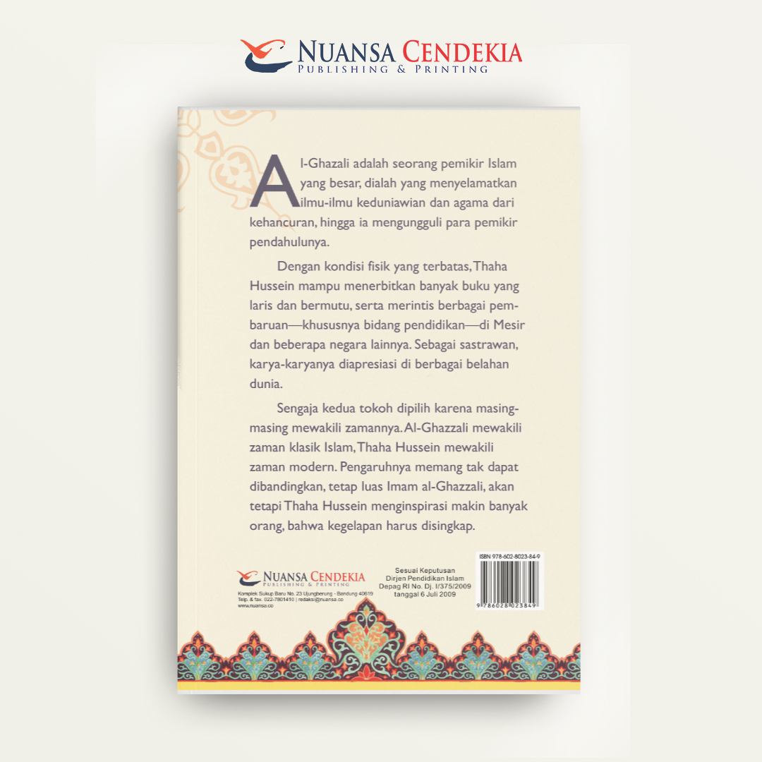 Dua Tokoh Besar Agama Islam: Imam al-Ghazzali dan Thaha Hussein adalah sebuah studi komparatif yang menganalisis pemikiran dan kontribusi dua figur intelektual Muslim yang sangat berpengaruh, namun hidup di era yang sangat berbeda: Imam al-Ghazzali (tokoh abad pertengahan yang merekonsiliasi filsafat dan tasawuf) dan Thaha Hussein (pemikir modernis Mesir yang berjuang untuk reformasi pendidikan dan sekularisme). Buku ini mengupas bagaimana al-Ghazzali berusaha mengatasi krisis intelektual di masanya dengan mengintegrasikan rasionalitas dengan spiritualitas, sementara Thaha Hussein, melalui pandangan-pandangannya yang kontroversial, berupaya menyelaraskan warisan Islam dengan tuntutan modernitas dan pemikiran Pencerahan Barat. Perbandingan ini menyoroti spektrum luas pemikiran dalam Agama Islam, dari tradisi klasik yang berfokus pada kebenaran batin hingga upaya reformasi kontemporer yang menekankan pemikiran kritis dan kemajuan sosial.