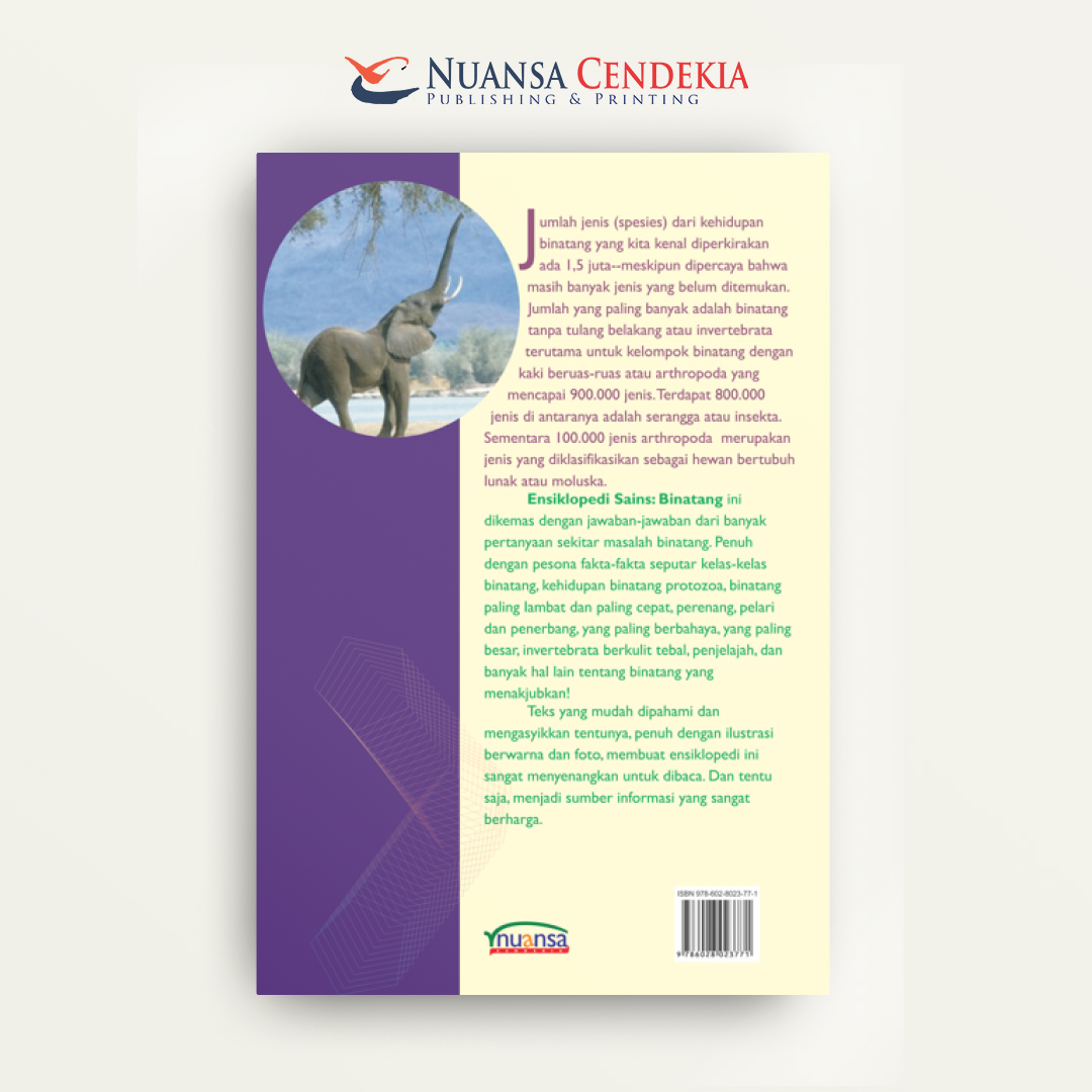 Ensiklopedi Sains: Binatang ini dikemas dengan jawaban-jawaban dari banyak pertanyaan sekitar masalah binatang. Penuh dengan pesona fakta-fakta seputar kelas-kelas binatang, kehidupan binatang protozoa, binatang paling lambat dan paling cepat, perenang, pelari dan penerbang, yang paling berbahaya, yang paling besar, invertebrata berkulit tebal, penjelajah, dan banyak hal lain tentang binatang yang menakjubkan!