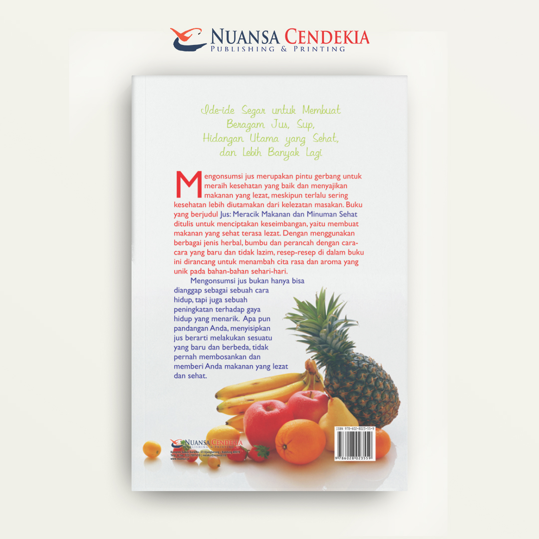 Mengonsumsi jus merupakan pintu gerbang untuk meraih kesehatan yang baik dan menyajikan makanan yang lezat, meskipun terlalu sering kesehatan lebih diutamakan dari kelezatan masakan. Buku yang berjudul Jus: Meracik Makanan dan Minuman Sehat ditulis untuk menciptakan keseimbangan, yaitu membuat makanan yang sehat terasa lezat. Dengan menggunakan berbagai jenis herbal, bumbu dan perancah dengan cara-cara yang baru dan tidak lazim, resep-resep di dalam buku ini dirancang untuk menambah cita rasa dan aroma yang unik pada bahan-bahan sehari-hari.