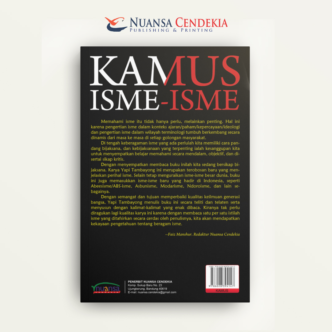 Buku Kamus Isme-isme berfungsi sebagai panduan referensi yang komprehensif, mencakup dan menjelaskan ribuan istilah yang berakhiran "-isme"—sebuah sufiks yang menandakan suatu doktrin, sistem, teori, atau gerakan—dari berbagai disiplin ilmu, termasuk Filsafat (misalnya, Eksistensialisme), Teologi (Monoteisme), Seni (Kubisme), Ilmu Sosial dan Politik (Sosialisme, Konservatisme), Hukum (Positivisme), hingga ranah Psikologi (Behaviorisme), Biologi (Darwinisme), dan Medis (Holisme). Dengan menyajikan definisi ringkas dan konteks historis-konseptual untuk setiap 'isme', kamus ini membantu pembaca untuk membedakan dan memahami secara cepat ideologi, aliran pemikiran, atau pandangan dunia yang kompleks dan sering kali tumpang tindih, menjadikannya sumber penting untuk memperkaya wawasan dan memperjelas diskusi lintas disiplin.