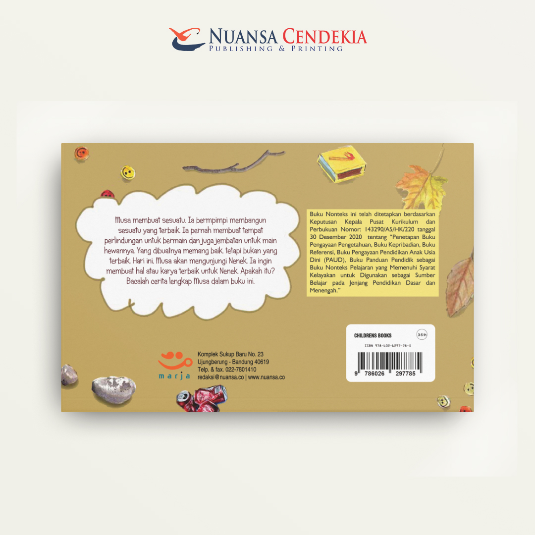 Musa membuat sesuatu. Ia bermpimpi membangun sesuatu yang terbaik. Ia pernah membuat tempat perlindungan untuk bermain dan juga jembatan untuk main hewannya. Yang dibuatnya memang baik, tetapi bukan yang terbaik. Hari ini, Musa akan mengunjungi Nenek. Ia ingin membuat hal atau karya terbaik untuk Nenek. Apakah itu? Bacalah cerita lengkap Musa dalam buku ini.