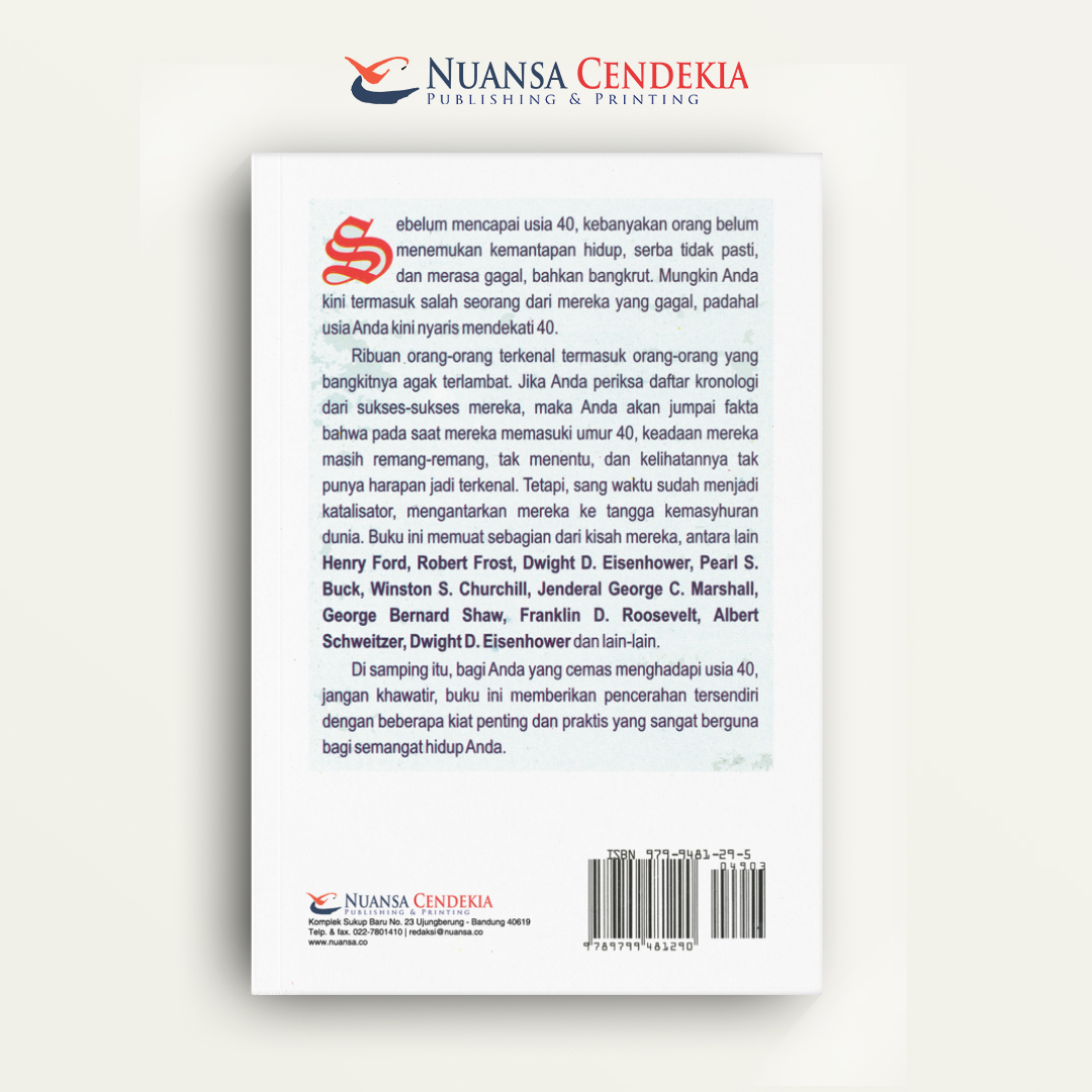 Sebagian orang menghadapi ketakutan ketika harus menghadapi usia 40 tahun, ribuan orang-orang terkenal termasuk orang-orang yang bangkitnya agak terlambat tetapi akan dijumpai fakta bahwa pada saat mereka memasuki umur 40 tahun, keadaan mereka masih remang-remang, tak menentu, dan kelihatannya tak punya harapan untuk jadi terkenal, tetapi sang waktu mengantarkan mereka ke tangga kemashuran dunia. Buku ini membahas kisah kisah mereka, antara lain Henry Ford, Robert Fros, Dwight D. Eisenhower, Pearl S.Buck, Winston S. Churchil, Jenderal George C. Marshall, George Bernard Shaw, Franklin D.Roosevelt, Albert Scweitzer, Dwight D.Eisenhower dan lain-lain
