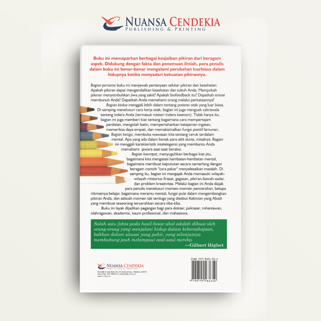 Buku ini memaparkan berbagai keajaiban pikiran dari beragam aspek. Didukung dengan fakta dan penemuan ilmiah, para penulis dalam buku ini benar benar mengalami perubahan luarbiasa dalam hidupnya ketika menyadari kekuatan pikirannnya.