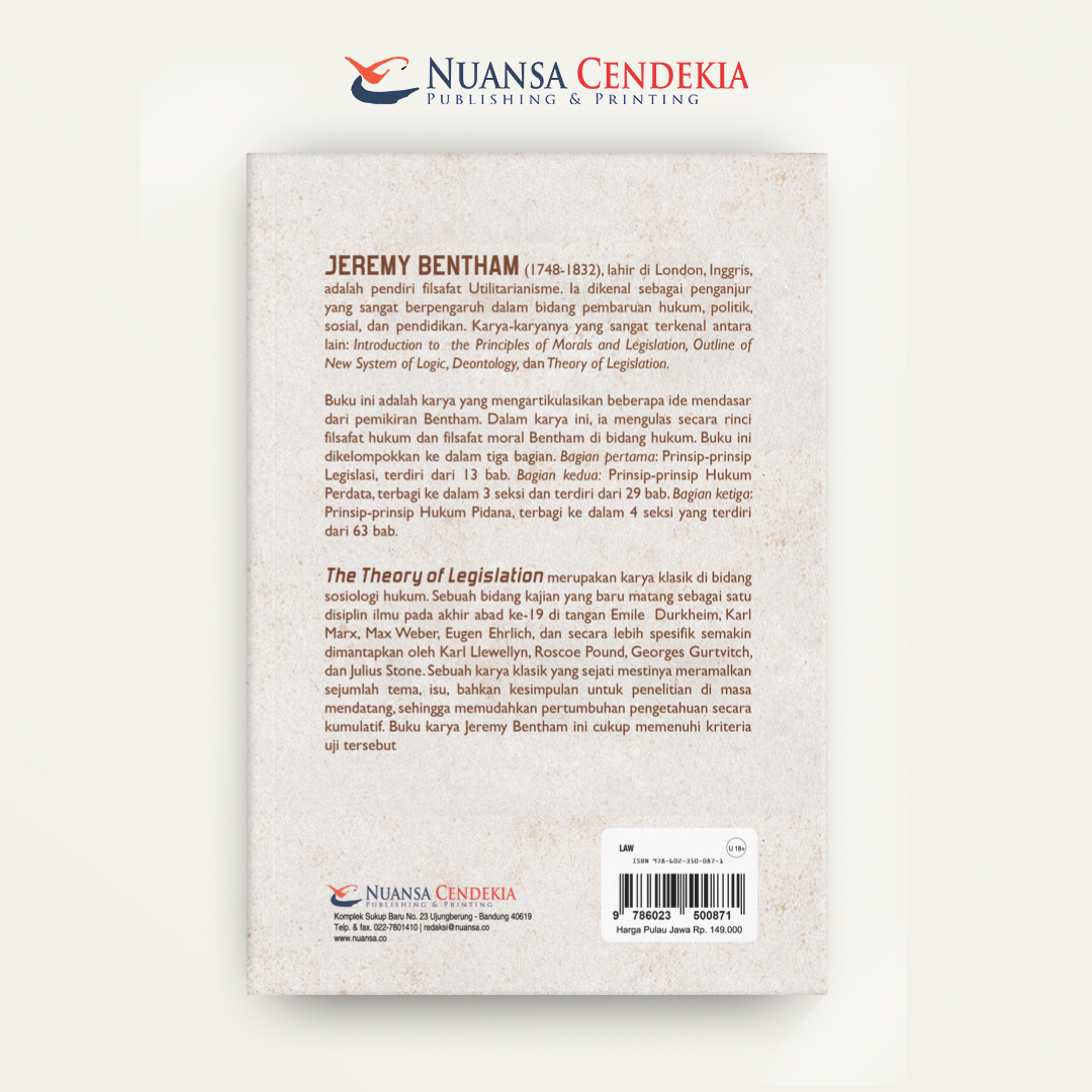 JEREMY BENTHAM (1748-1832), lahir di London, Inggris, adalah pendiri filsafat Utilitarianisme. Ia dikenal sebagai penganjur yang sangat berpengaruh dalam bidang pembaruan hukum, politik, sosial, dan pendidikan. Karya-karyanya yang sangat terkenal antara lain: Introduction to the Principles of Morals and Legislation, Outline of New System of Logic, Deontology, dan Theory of Legislation. Buku ini adalah karya yang mengartikulasikan beberapa ide mendasar dari pemikiran Bentham. Dalam karya ini, ia mengulas secara rinci filsafat hukum dan filsafat moral Bentham di bidang hukum.
