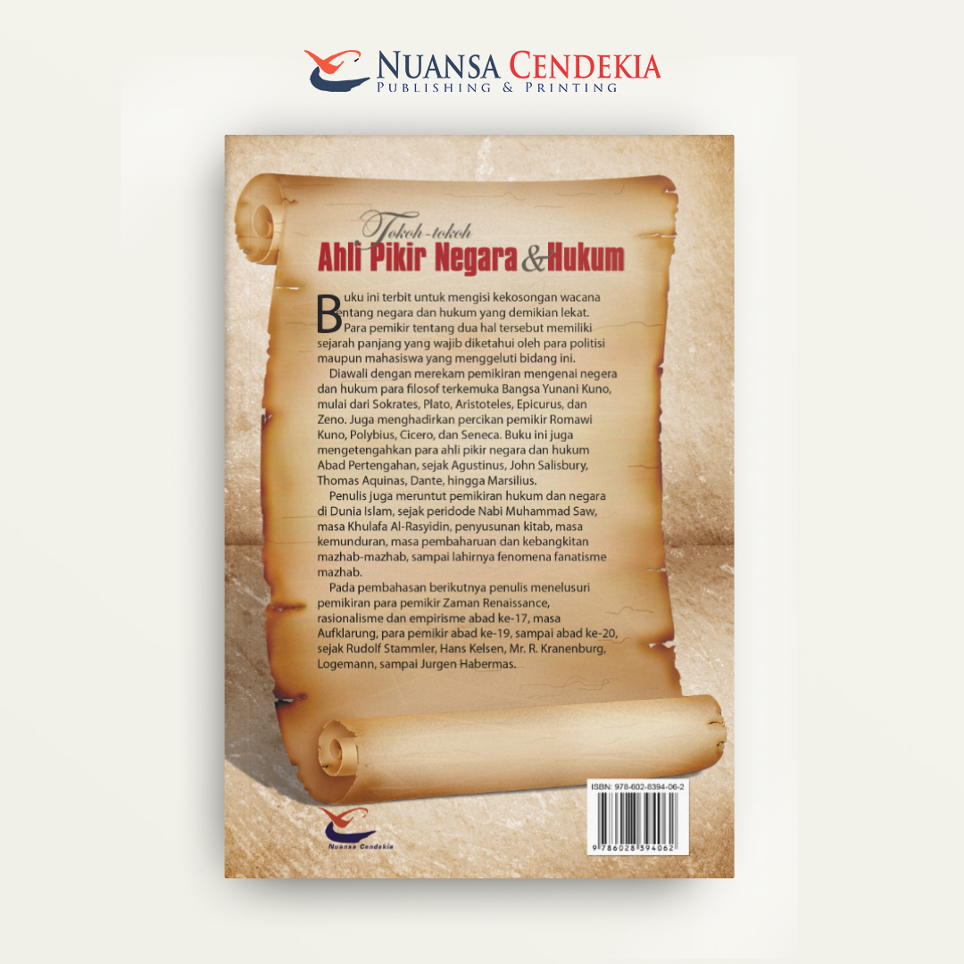 Buku ini terbit untuk mengisi kekosongan wacana tentang negara dan hukum yang demikian lekat. Para pemikir tentang dua hal tersebut memiliki sejarah panjang yang wajib diketahui oleh para politisi maupun mahasiswa yang menggeluti bidang ini. Diawali dengan merekam pemikiran mengenai negera dan hukum para filosof terkemuka Bangsa Yunani Kuno, mulai dari Sokrates, Plato, Aristoteles, Epicurus, dan Zeno. Juga menghadirkan percikan pemikir Romawi Kuno, Polybius, Cicero, dan Seneca. Buku ini juga mengetengahkan para ahli pikir negara dan hukum Abad Pertengahan, sejak Agustinus, John Salisbury, Thomas Aquinas, Dante, hingga Marsilius. Penulis juga meruntut pemikiran hukum dan negara di Dunia Islam, sejak peridode Nabi Muhammad Saw, masa Khulafa Al-Rasyidin, penyusunan kitab, masa kemunduran, masa pembaharuan dan kebangkitan mazhab-mazhab, sampai lahirnya fenomena fanatisme mazhab.