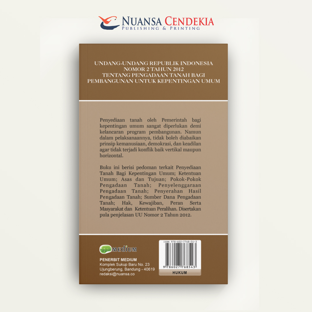 Buku ini berisi pedoman terkait Penyediaan Tanah Bagi Kepentingan Umum; Ketentuan Umum; Asas dan Tujuan; Pokok-Pokok Pengadaan Tanah; Penyelenggaraan Pengadaan Tanah; Penyerahan Hasil Pengadaan Tanah; Sumber Dana Pengadaan Tanah; Hak, Kewajiban, Peran Serta Masyarakat dan Ketentuan Peralihan. Disertakan pula penjelasan UU Nomor 2 Tahun 2012.